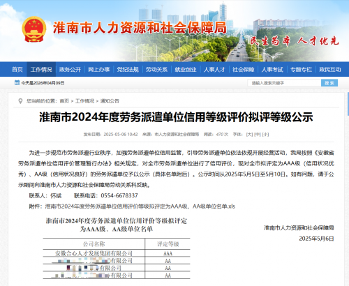 淮南市人力资源和社会保障局发布《淮南市2024年度劳务派遣单位信用等级评…...