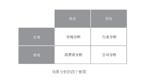 场景分析是确定这五个关键数据点的来源的有效方法。弗雷德将市场分析、行业分析、消费者分析和公司分析从宏观、微观、需求和供给方面作为场景分析的四个象限来看待,并且在每个象限中都选出了一个关键的可视化工具。