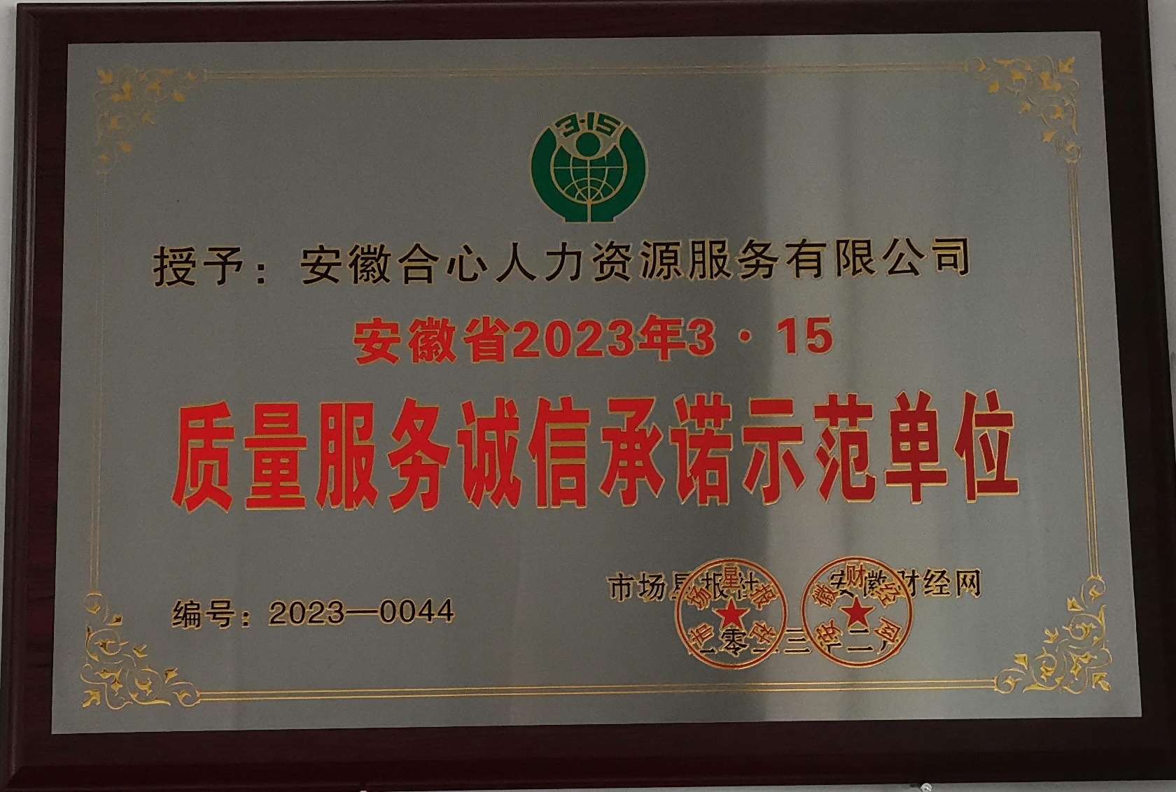 【合心人力】我司荣获安徽省2023年3·15质量服务诚信承诺示范单位