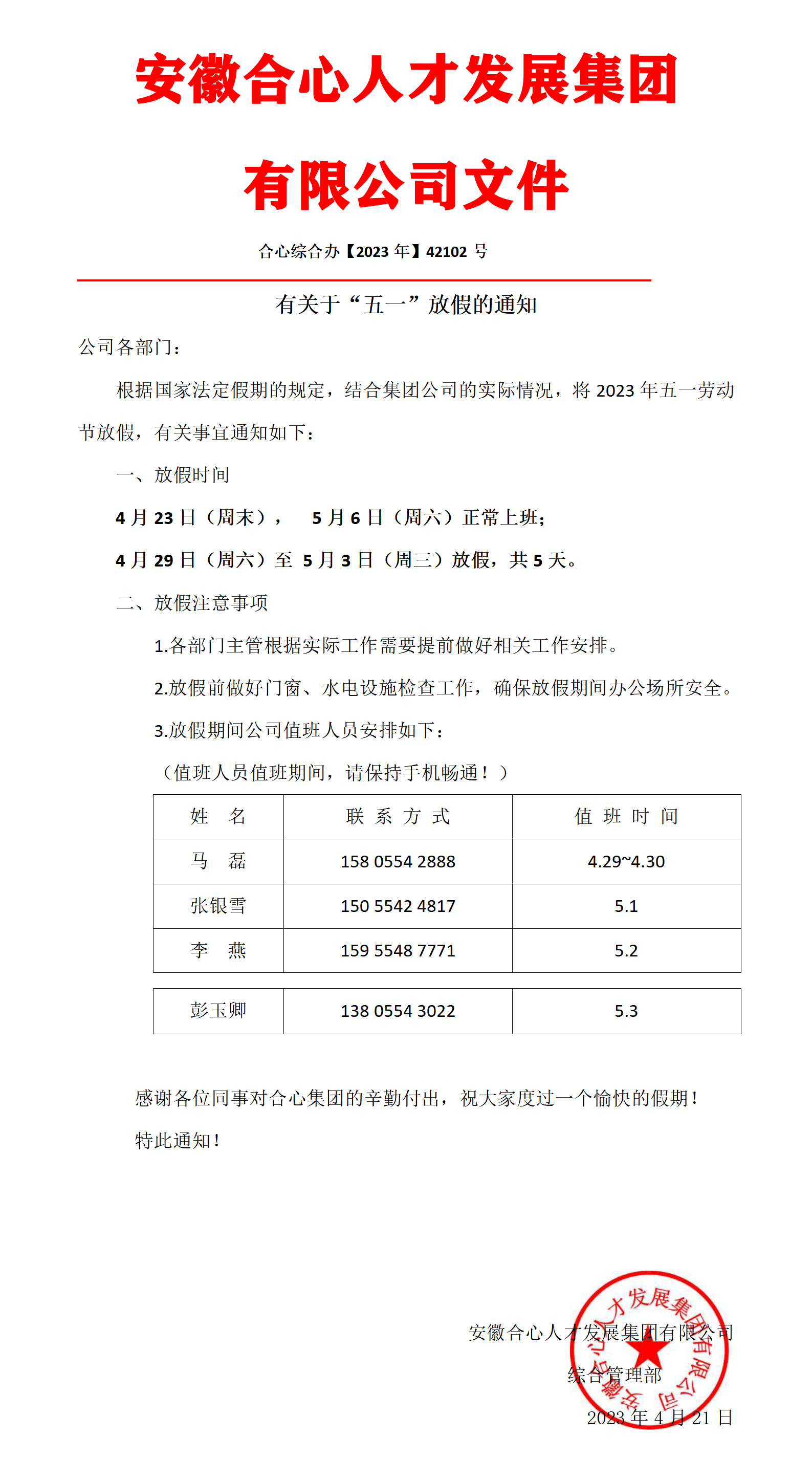 【通知公告】有关于2023年“五一”放假的通知