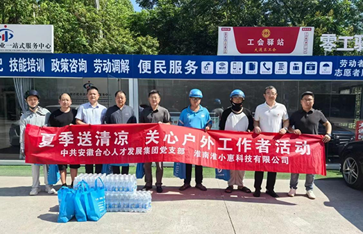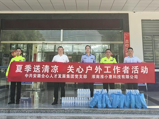 在调研活动间隙,中共安徽合心人才发展集团党支部、淮南淮小惠科技有限公司联合开展“共建美好淮南服务新业态 关心户外劳动者”慰问活动,表达对户外劳动者的关怀与问候。中共安徽合心人才集团党支部书记彭玉卿、集团总经理马磊及淮南淮小惠科技有限公司负责人田明明先后来到配送网点,交警大队、外卖配送员驿站、城管值班岗亭及环卫工人驿站、发放矿泉水、西瓜、防暑喷剂及防晒物品。提醒高温天气应对举措,做好个人防暑降温。