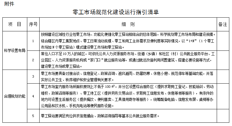 《零工市场规范化建设运行指引(征求意见稿)》包括指导思想、总体目标、工作要求、保障措施等四个部分。坚持以习近平新时代中国特色社会主义思想为指导,深入贯彻党的二十大以及二十届二中、三中全会精神,全面落实实施稳就业提质扩量服务“家门口”就业三年行动工作部署,建设一批区域性行业性零工市场、功能化便捷化零工驿站,支持灵活就业健康发展。到2025年底,通过新建、改造或设置服务专区等方式,在全省建成100个左右的公益性零工市场和一批零工驿站。以县(市、区)为单位,原则上常住人口达10万人的城区至少建设1个公益性零工市场。提出科学设置布局、合理规划功能、统一建设标准、规范运行服务、优化服务供给、强化权益维护、加强信息支撑等七个方面工作要求,明确加强组织领导、加强资金保障、加强监督管理、加强宣传引导等四个方面保障措施,推动各地建设零工市场或零工驿站建设有章可循。