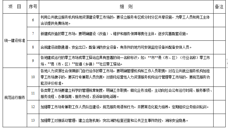 (三)统一建设标准。利用公共就业服务机构场地资源建设零工市场的,要设立服务专区或分时分区共享设施,为零工人员和用工主体洽谈提供免费场地;新建或改造的零工市场,要明确建设(改造)、维护和服务保障等责任主体,逐步完善配套设施,更好满足零工人员和市场主体求职招聘需要。应合规建设疏散通道、安全出口,配备消防安全设备,有条件的地方可安装监控设备并配备安保人员。各地建成运行的零工市场或零工驿站应具有显著的统一名称标识,如:**市**县(市、区)(行业名称)零工市场、**县(市、区)**街道(乡镇)**社区零工驿站。