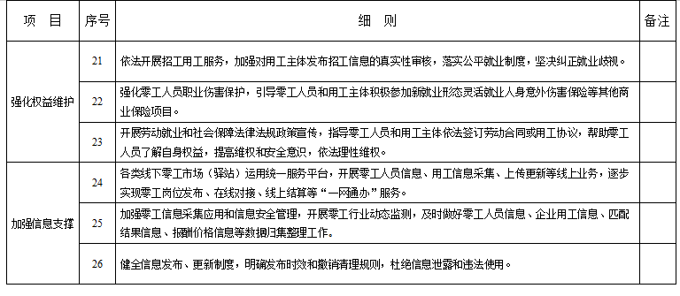 (七)加强信息支撑。优化“三公里”就业圈服务功能,同步推进线上零工市场建设,依托“一库一平台”搭建线上零工统一服务平台。各类线下零工市场(驿站)要运用统一服务平台,开展零工人员信息、用工信息采集、上传更新等线上业务,逐步实现零工岗位发布、在线对接、线上结算等“一网通办”服务,提高零工服务便捷度和精准性。要加强零工信息采集应用和信息安全管理,开展零工行业动态监测,及时做好零工人员信息、企业用工信息、匹配结果信息、报酬价格信息等数据归集整理工作;健全信息发布、更新制度,明确发布时效和撤销清理规则,杜绝信息泄露和违法使用。