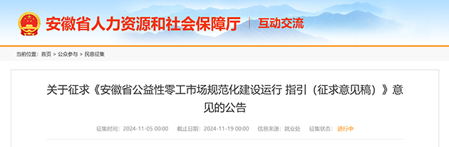 关于征求《安徽省公益性零工市场规范化建设运行指引(征求意见稿)》意见的公告