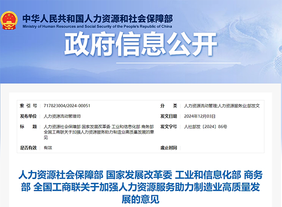 人社部等五部门关于加强人力资源服务助力制造业高质量发展的意见