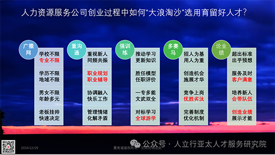 在人力资源服务公司创业过程中,”选用育留“好人才是公司成功的关键。通过广撒网、重沟通、强训练、多赛马、论业绩的策略,公司可以有效地吸引、培养和保留人才,为公司的长期发展打下坚实的基础。这些做法不仅适用于人力资源服务行业,也可以为其他行业的初创和中小公司提供借鉴。