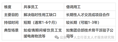 关键区别:共享员工存在劳动关系混淆风险(用工企业可能被认定为雇主);借调因多用于关联企业,法律风险较低。