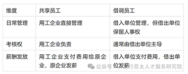 关键区别:共享员工中,用工企业有更大管理权;借调员工仍受原单位制度约束(如晋升规则)。