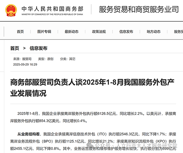 9月底,商务部服贸司负责人在“谈2025年1-8月我国服务外包产业发展情况”中通报:承接离岸业务流程外包(BPO)执行额1125.1亿元,同比增长21.2%,是ITO、BPO、KTO三项外包服务增长最快的一项。年初,商务部发布的数据显示,2024年中国企业承接服务外包合同额30535亿元,执行额22197亿元,同比分别增长6.5%和13.3%。中国企业承接服务外包合同额首次突破3万亿元,这是中国服务外包产业发展进程中的又一重要里程碑。