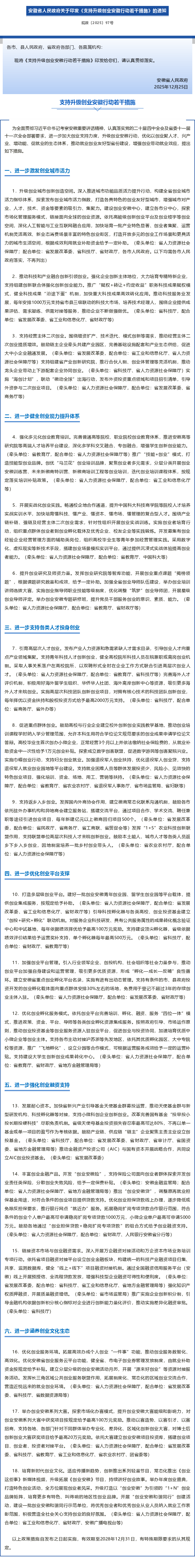 安徽省人民政府关于印发《支持升级创业安徽行动若干措施》的通知